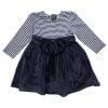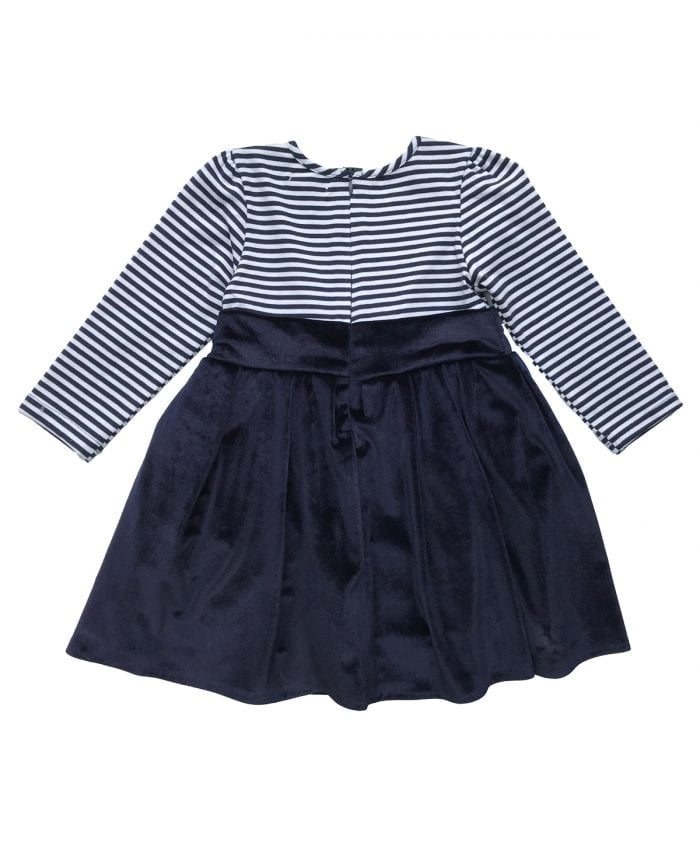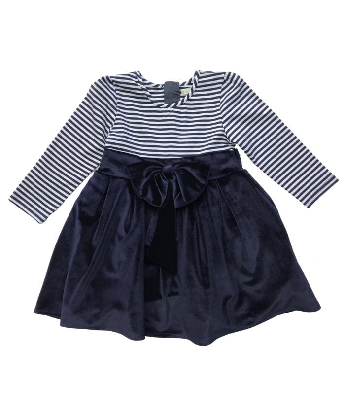 Featuring our pretty jersey and Velvet Skirt for Baby Girl in London, Mix it up with Amelia. The casual navy and white stripe nautical top and a luxurious velvet skirt make the perfect outfit for a kid’s party. No frills or fuss, pain cute! Whatever the occasion, this classy velvet dress for a baby girl is guaranteed to attract compliments.
