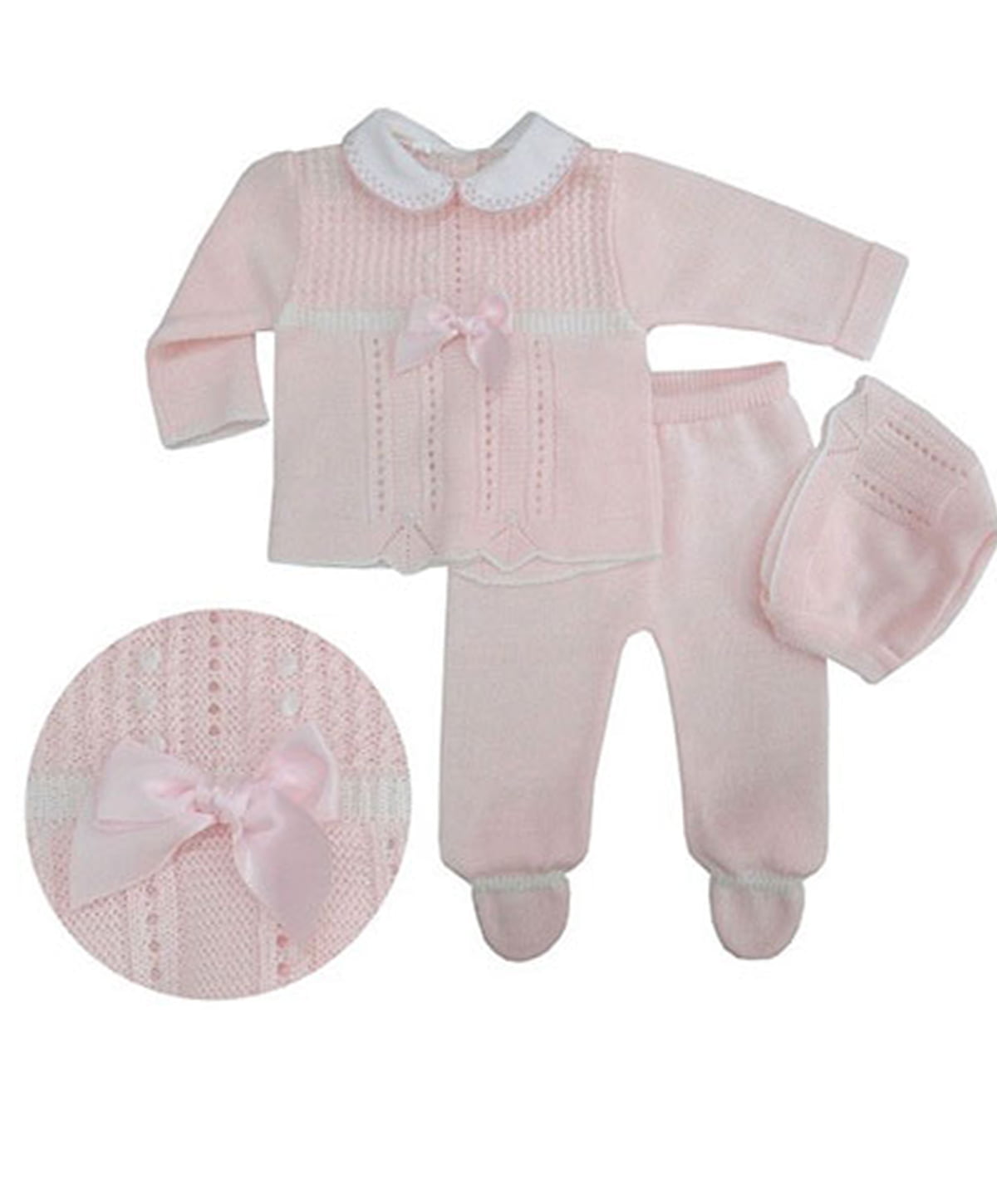 This gorgeous three piece suit will ensure your baby looks the part at any special occasion this season. The sweet bonnet and embroidered woven peter pan collar play up the traditional look. The top is adorned with gorgeous contrasting knits, pretty knitted flowers, and a pink bow. It comes with a pair of matching footed trousers to ensure your baby looks their best.