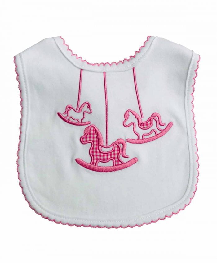 This beautiful babies bib with a rocking horse (appliqué/embroidery) in sky blue or pink will keep your baby clean and dry. Made from 100% cotton your little one will feel comfortable and will look adorable.
