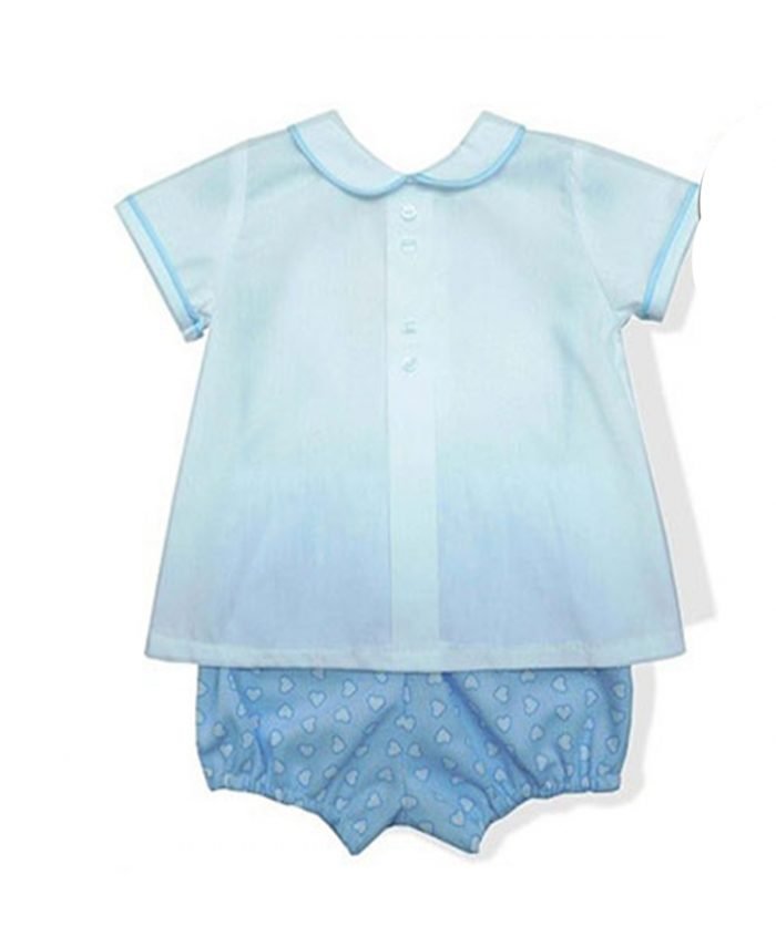 The shirt has short sleeves, and a Peter Pan collar trimmed with sky-blue piping. The sleeves are gathered into bound and piped cuffs for a subtle puffed fit. The centre front features a box pleat with two buttons at the neck, and the shirt fastens at the back with three white buttons. This Baby Boy Peter Pan Collar Shirt is printed with a cute love heart pattern and is elasticated at the waist and leg openings for a comfortable fit.