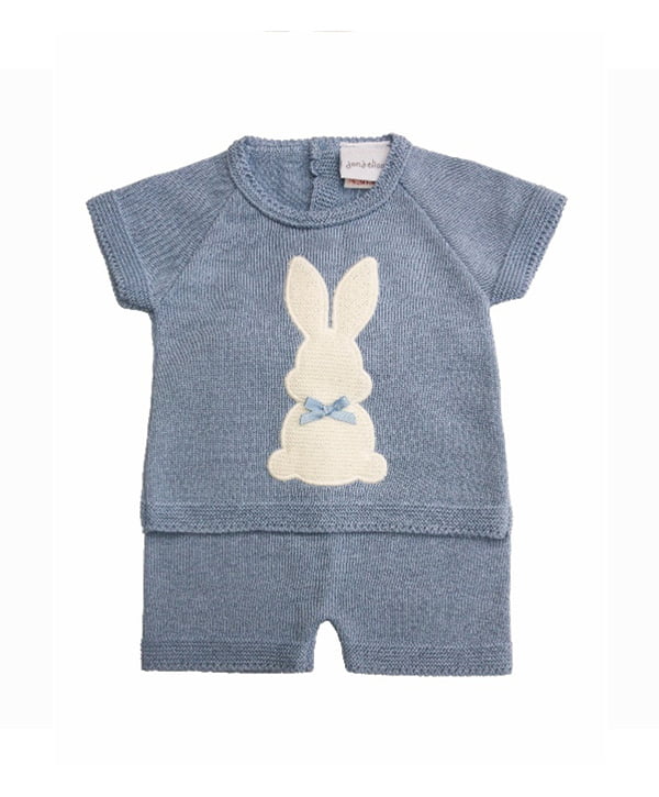 This gorgeous knitted outfit is bound to make little ones hop around with excitement, with adorable bunny garter stitch appliqué to the top and co-ordinating elasticated blue bottoms. A beautiful garter stitch around the neck, cuffs and hem give this outfit at the truly beautiful finish.