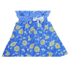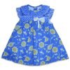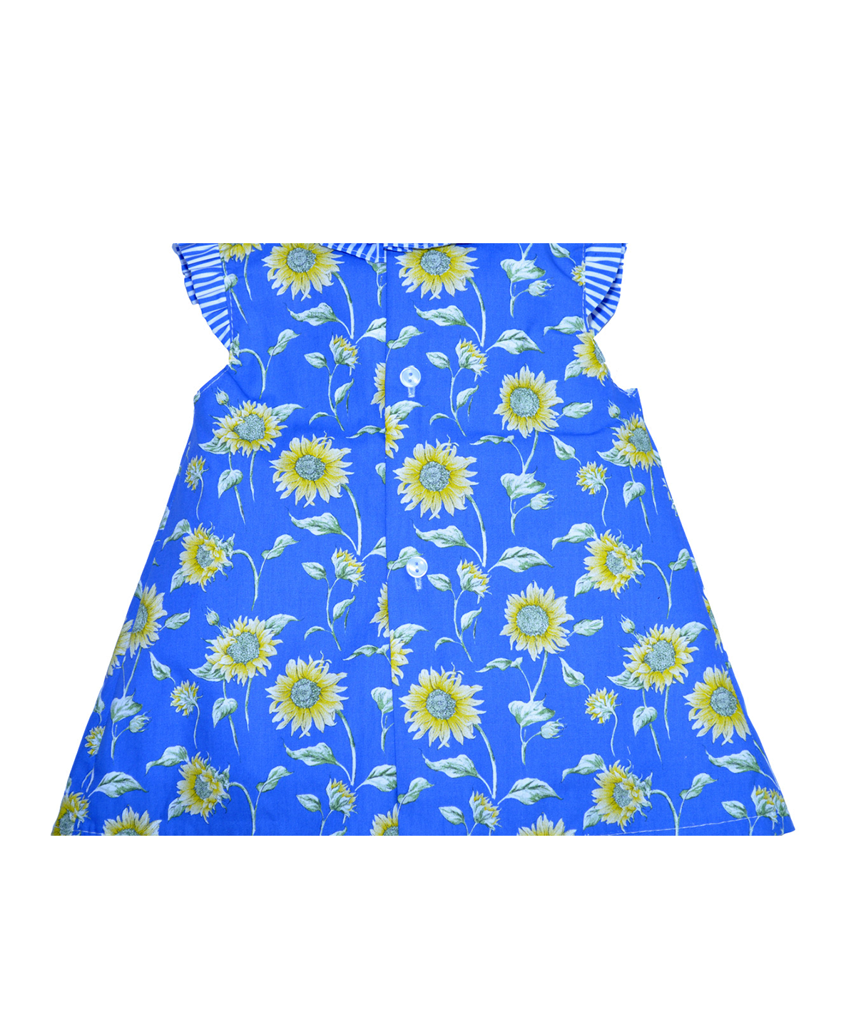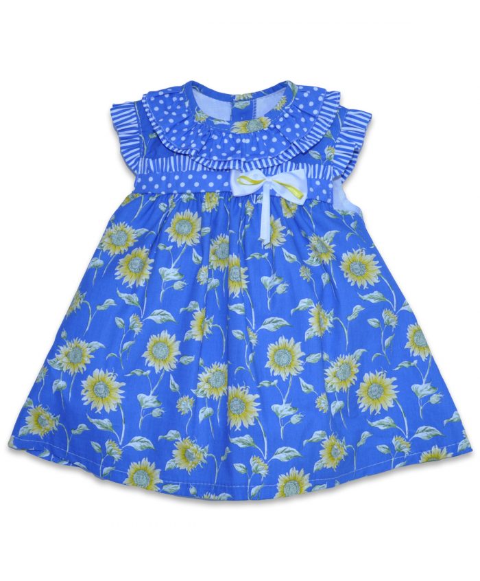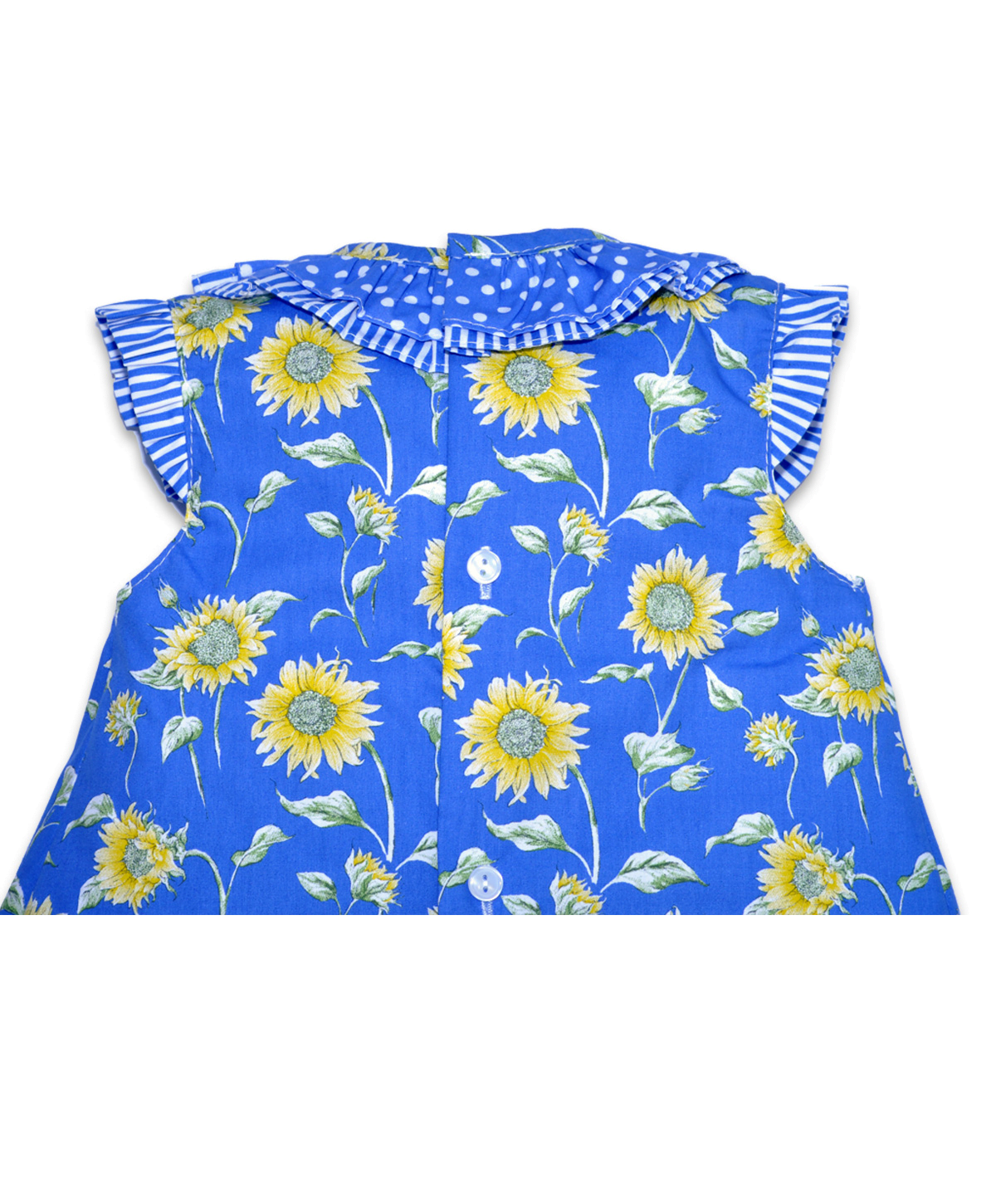 A Cute Sunflower Print Baby Girl Romper with Blue and White Striped Knickers has a High Round Neck Bound and Trimmed with Two Layers of Contrasting Ruffled Fabric. The top ruffle is printed with blue and white spots, and the bottom has blue and white stripes. This Sunflower Print Baby Girl Romper is sleeveless, and the armholes are trimmed with blue and white striped ruffles. There is a spot-printed band at the front with a striped frill detail gathered into it and a sweet white and yellow bow at the back. The dress fastens at the back with three white buttons and is fully lined with white fabric for comfort during wear.