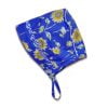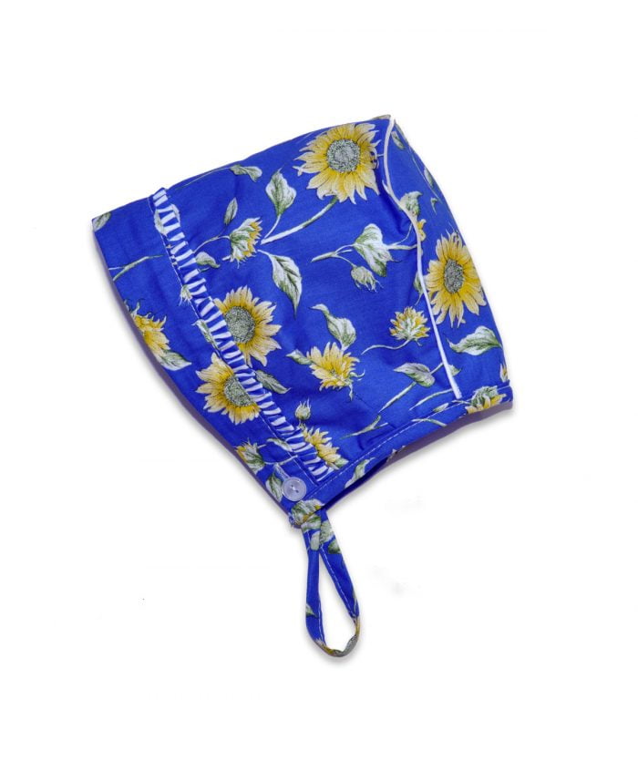 The sunflower-printed bonnet is very cute. The front is trimmed with frilled striped fabric, and the back is trimmed with white piping. It has side darts for a flattering fit, ties under the chin, and fastens on the left side with a white button.