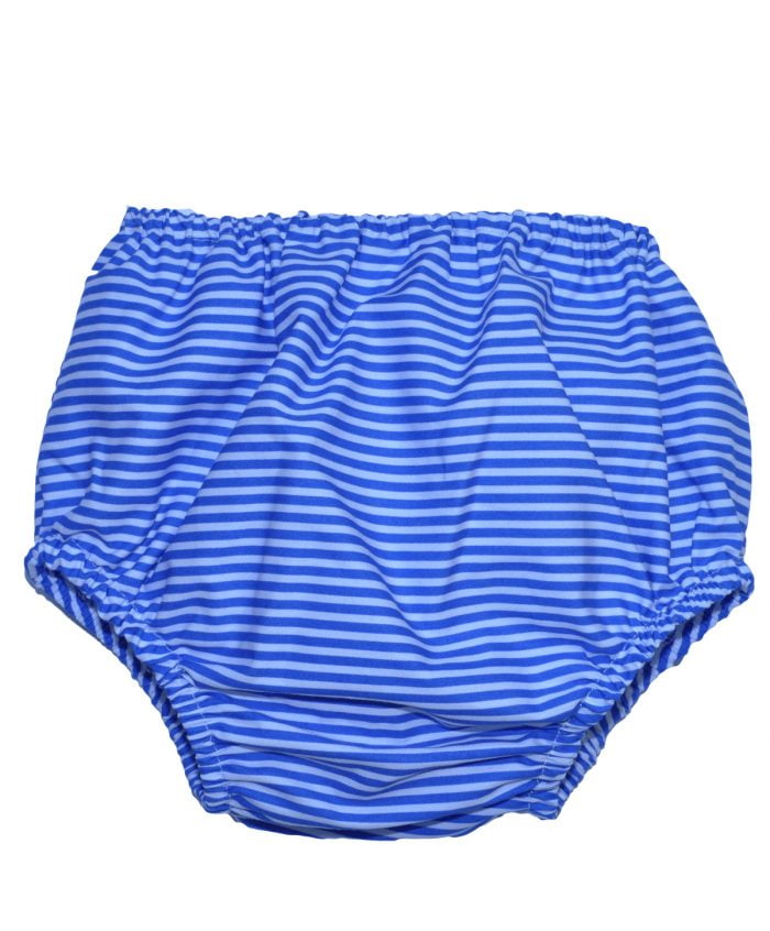 The knickers are in a blue and white horizontal striped fabric and are elasticated at the waist and leg openings for a comfortable fit.