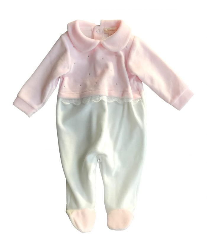 This beautiful pink and white velour sleepsuit will keep your little girl warm and cosy during the winter months. Embellished with diamantes and trimmed with a scalloped cotton ribbon your little girl will really sparkle. Your little girl looks absolutely gorgeous and you will not be able to resist snuggles with her.