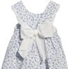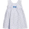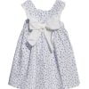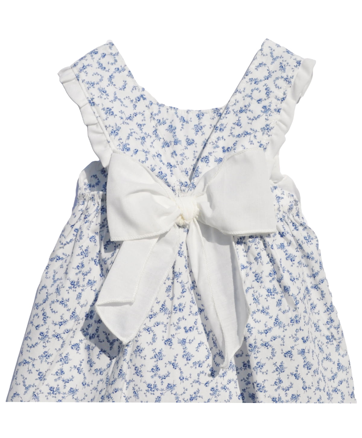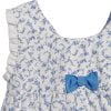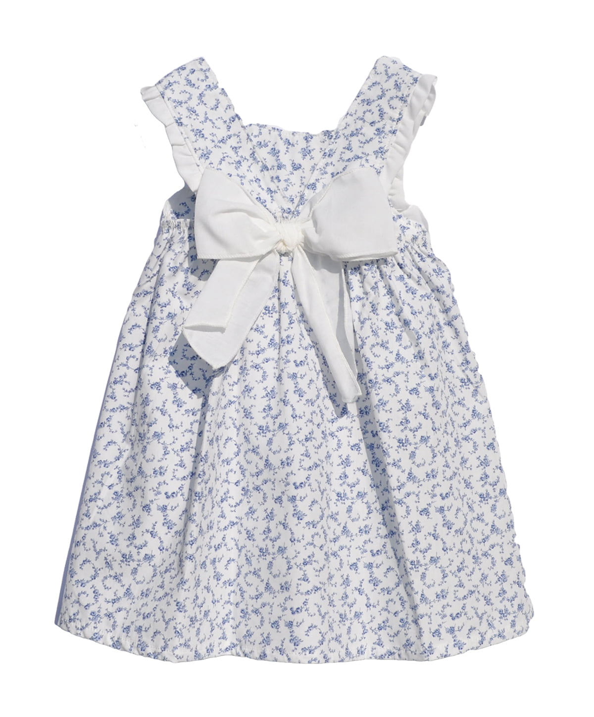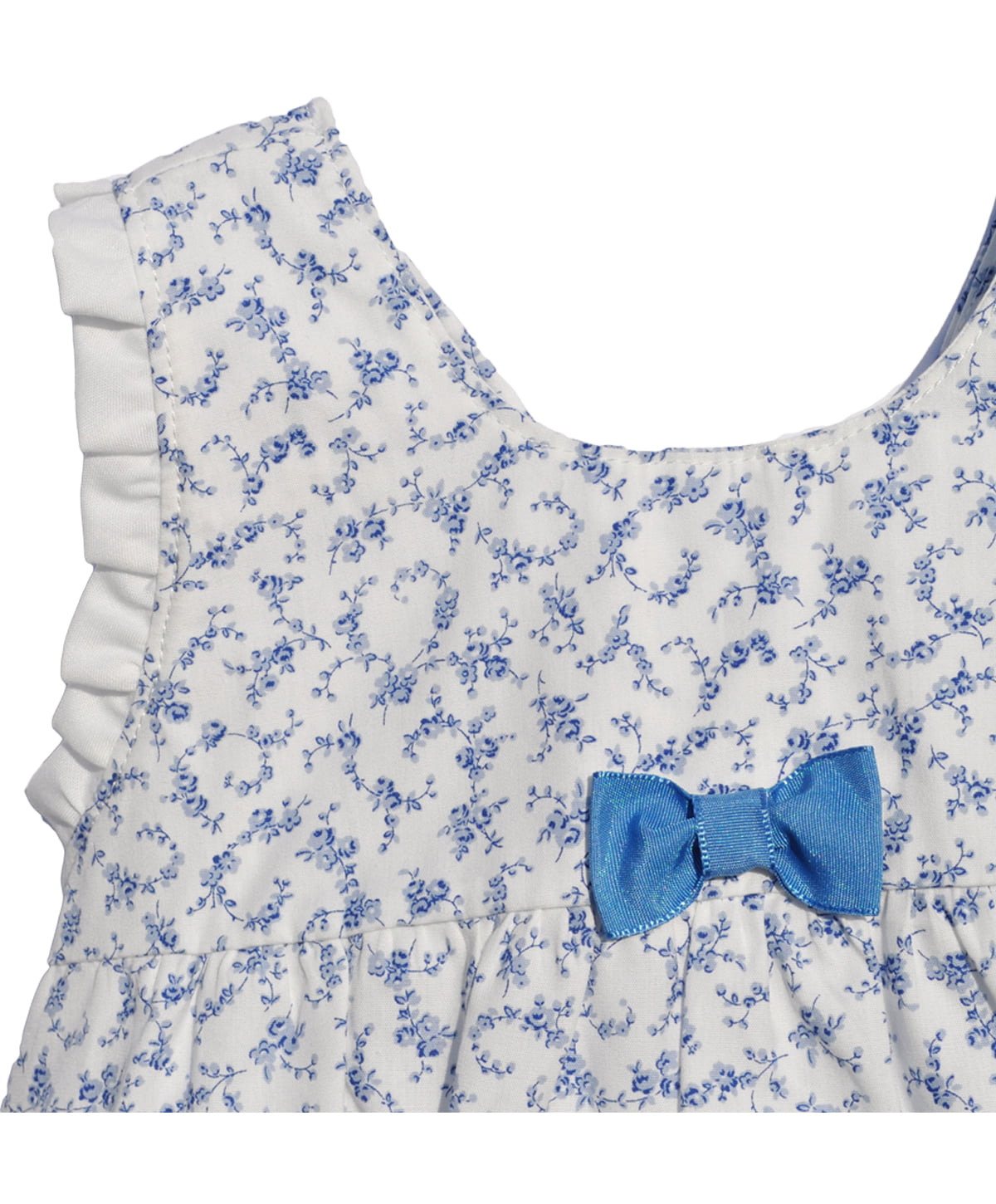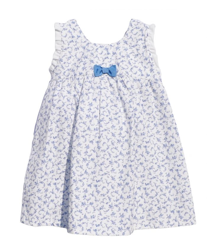 A lovely blue and white sleeveless summer dress in 100% cotton will keep your little one cool in the summer. The super sweet ditsy floral dress in comfy cotton, with ruffle trims and bow details, is hard to resist.