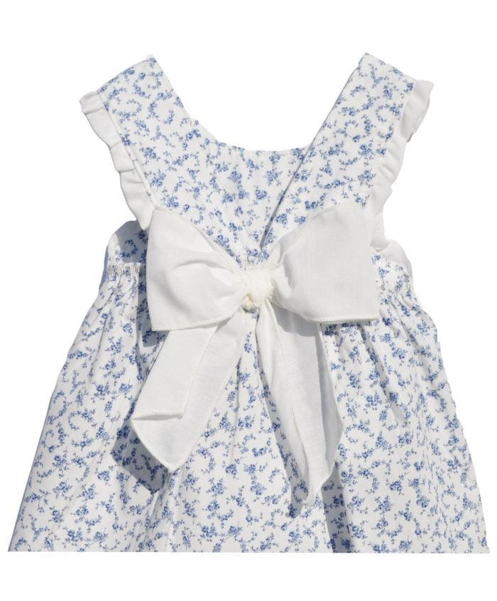 The cute A-line shape is lightly gathered into a high waistline and is finished with a blue bow at the front. The armholes are trimmed with a white cotton ruffle and the v-back has two buttons that fasten onto and elasticated back for comfort during wear, the back is finished with an oversized white cotton tied the bow.