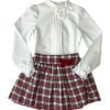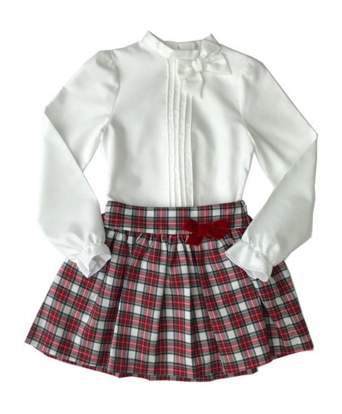 A beautiful set with white pin-tucked shirt and coordinating red check shirt. This beautiful shirt & skirt outfit will ensure your little girl looks beautiful for every time. Easily adapted for any occasion, this outfit can be dressed up with red or black tights and pretty black shoes or dressed down with a black biker jacket, chunky scarf and boots.