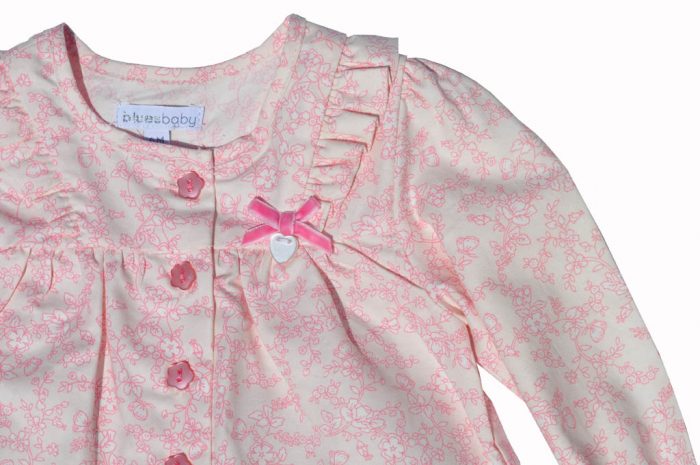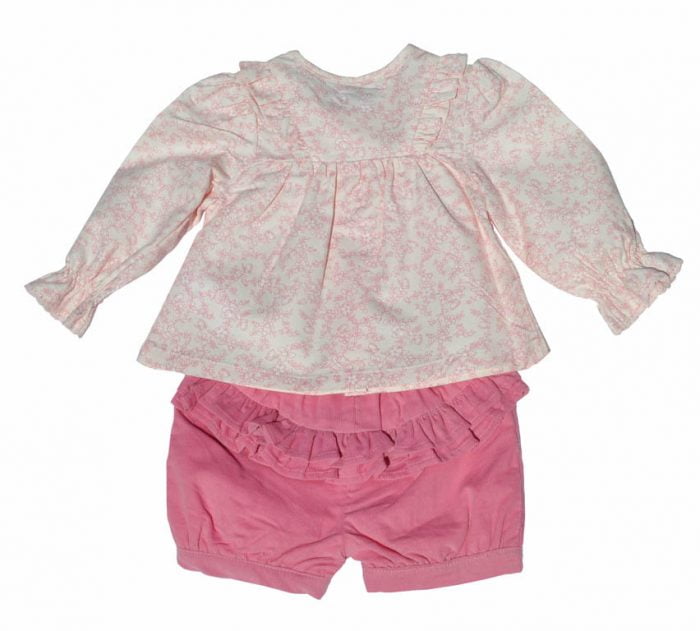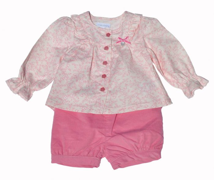 Our transitional floral print Shirt for Baby Girl with matching dusky pink shorts is an indispensable style, offering a more brilliant alternative for girl’s day wear. Wear it or layer it under a cardigan on cooler spring days. The little details make this outfit extra pretty, such as the frilled chest, crochet trimmed sleeves, pink flower buttons and a pretty bow. We do not forget the beautiful, lightweight bloomer-style shorts with frilled bottoms, that is the perfect outfit for those little crawlers to show off!