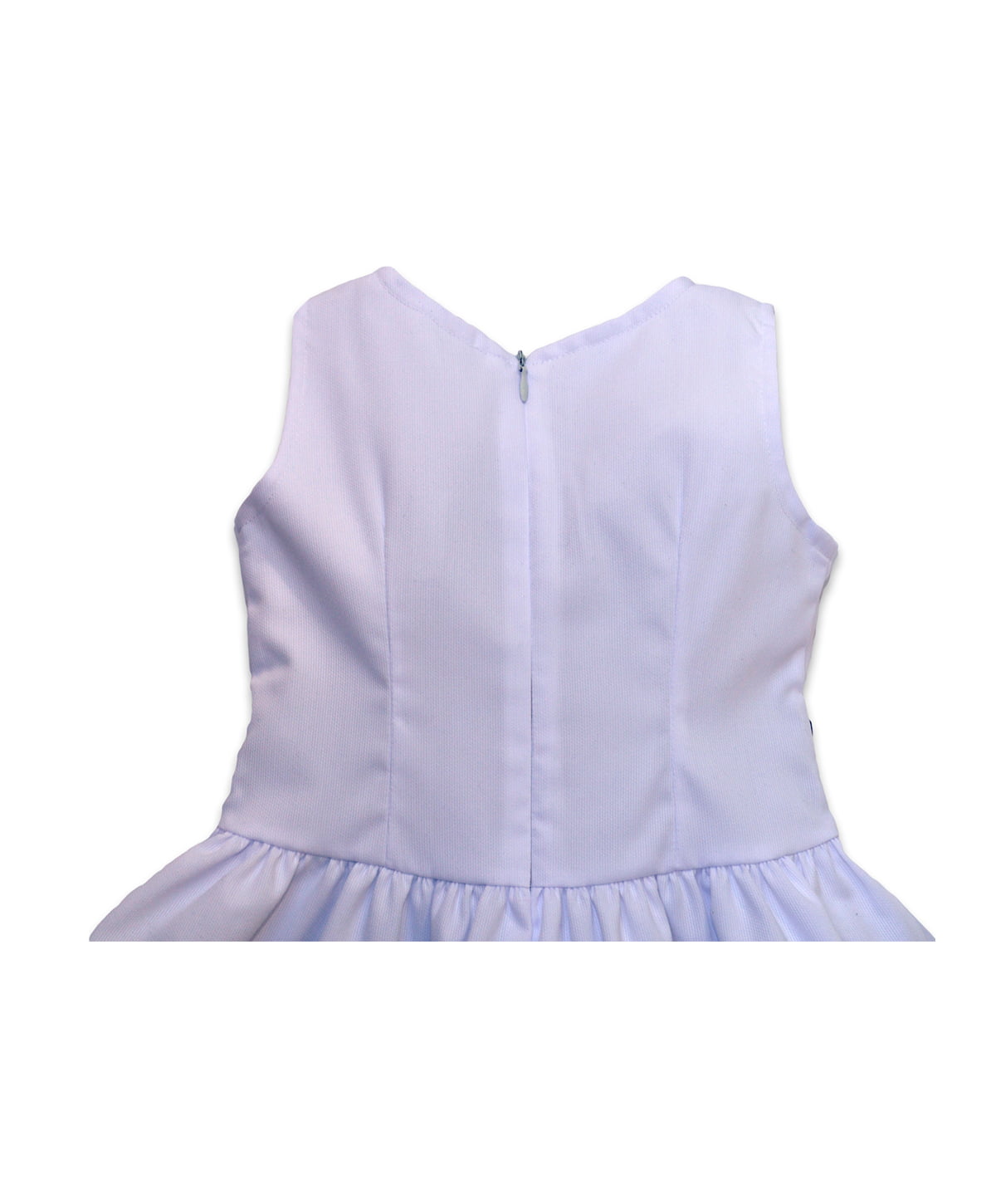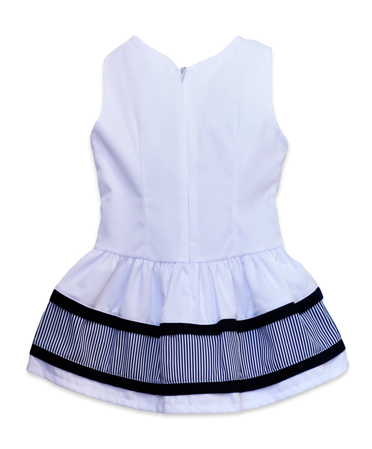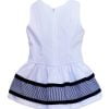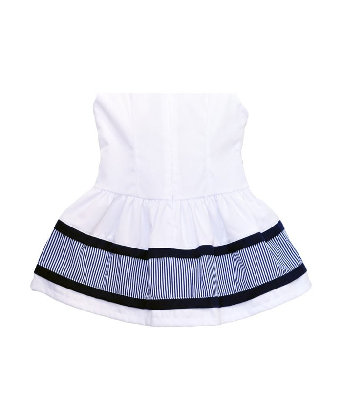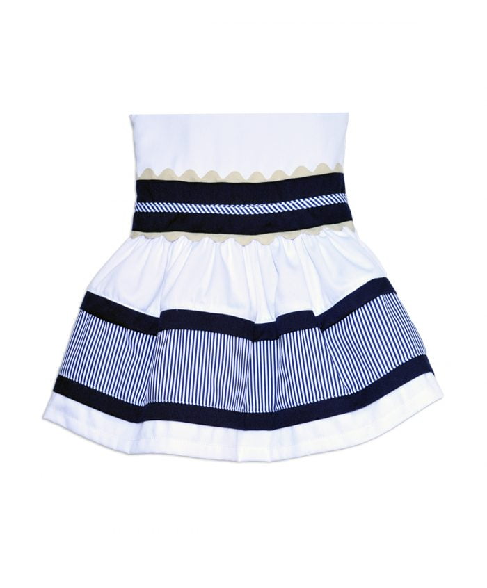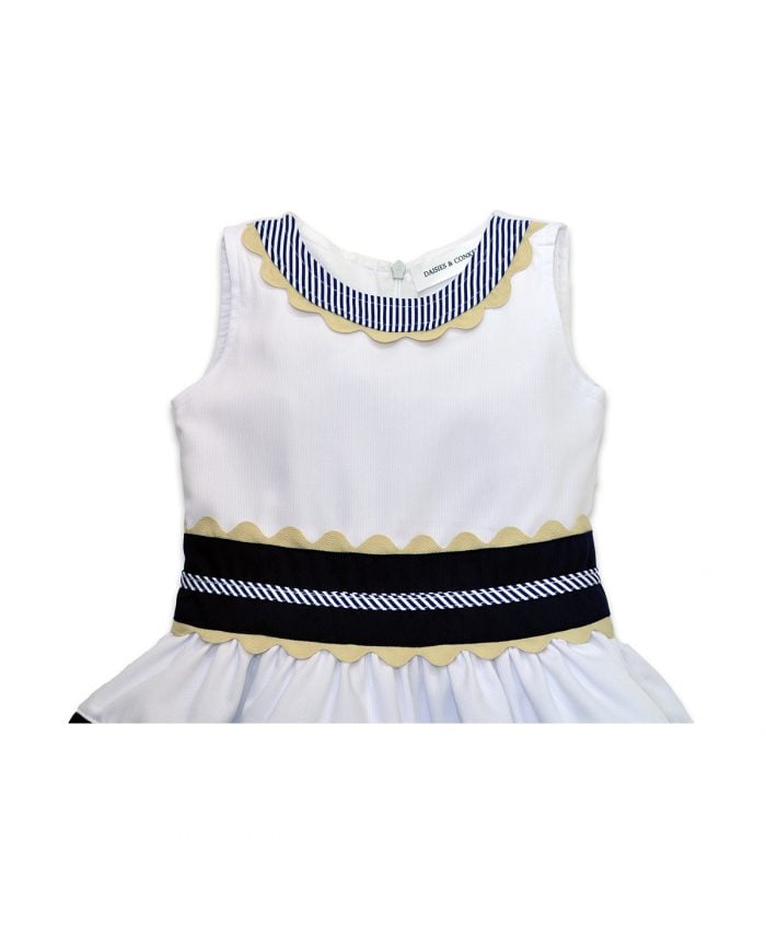 A chic French-inspired style dress that oozes sophistication in a crisp palette of navy, white and beige. The full skirt and gorgeous scalloped trim details around the neck and waist make this dress extra pretty.