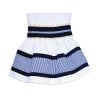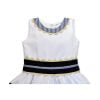 This dress is sleeveless with a round neck and is trimmed with navy/white striped fabric and a pretty beige scalloped detail. The front waist features a wide navy band also trimmed with striped fabric and beige scallops. This skater style fit dress in London is gathered into the waist for fullness and has a contrasting navy and white stripe panel just before the hem. The dress has a concealed zip at the centre back and two darts for a flattering fit.
