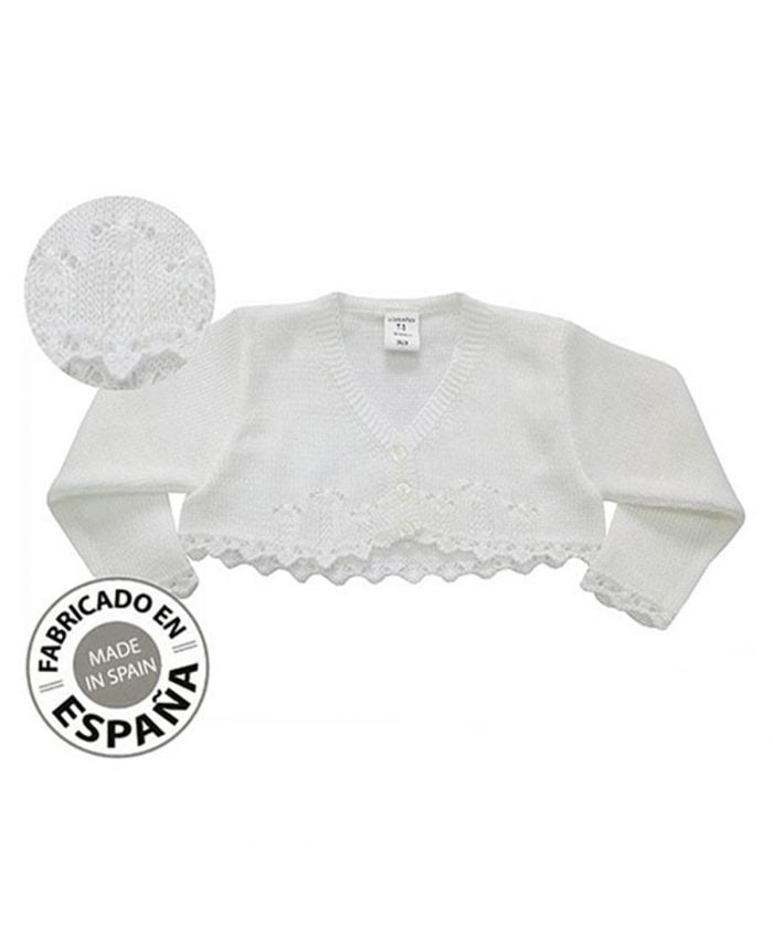 A pure white cropped Baby Girl Cardigan in London is an extra pretty classic style. Trimmed with a delicate pointelle stitch at the hem and cuff, this piece is perfect for teaming with jeans, skirts, and dresses.