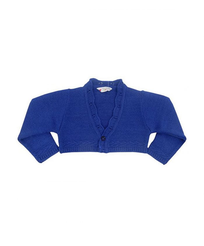 A beautiful girl’s blue cardigan is a great addition to your child’s wardrobe this season. The cropped style and delicate scalloped placket trim cardigan can co-ordinate with many of our styles. A great way to add a warm layer without too much weight.