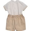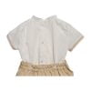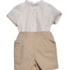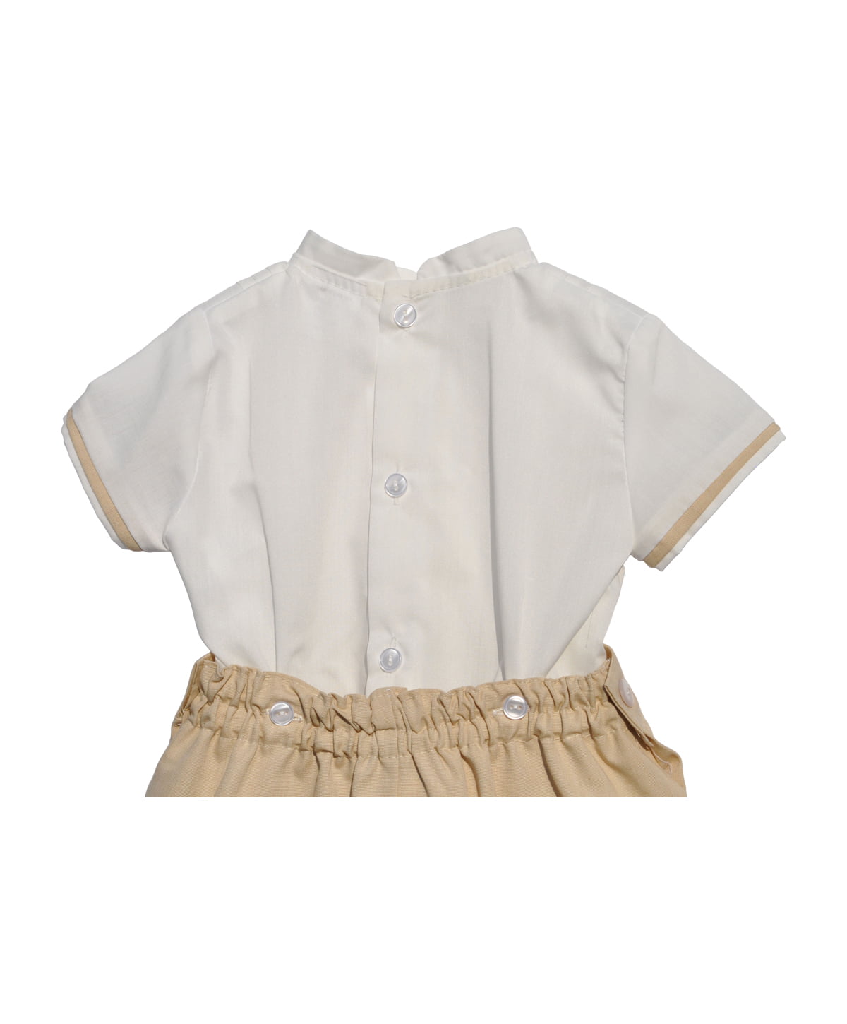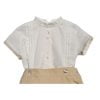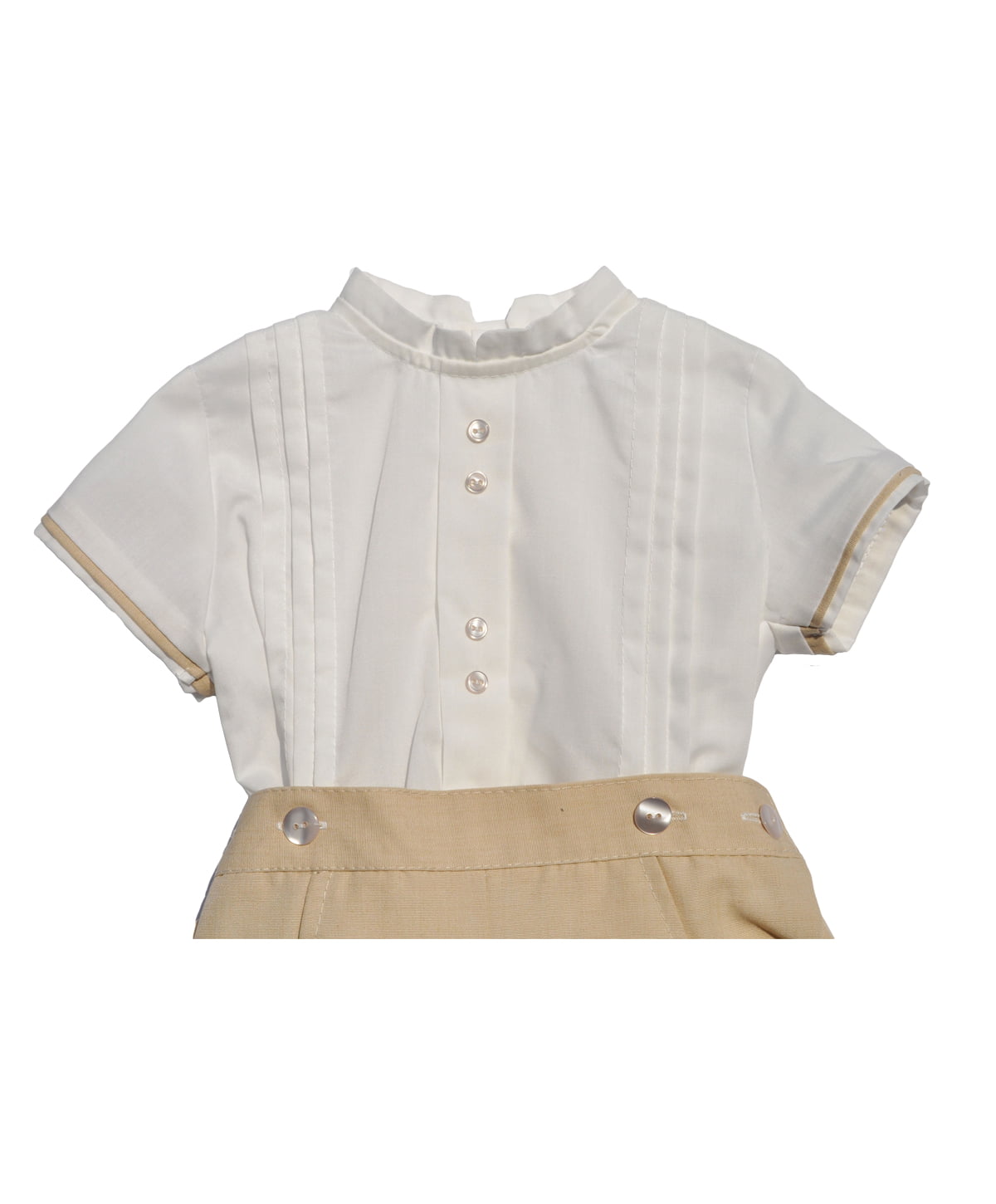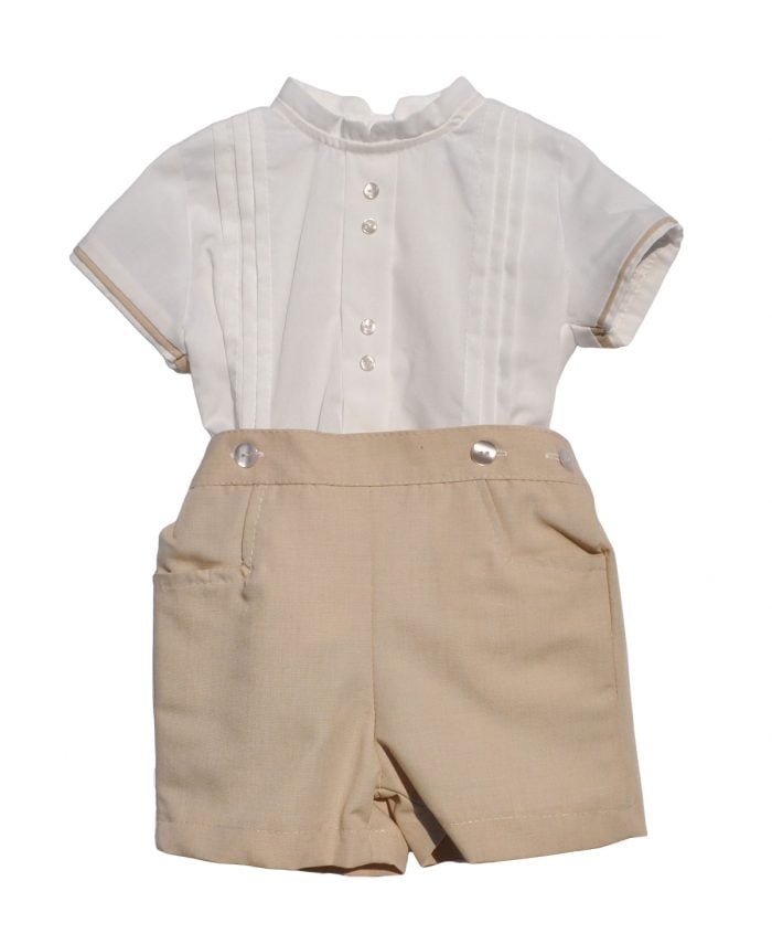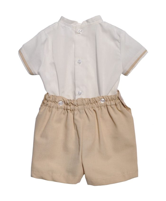 It has a Nehru collar and short sleeves that are trimmed with beige piping. It has a mock placket with four pearl effect buttons down the centre front and three pin-tuck pleats either side. The shirt fastens down the centre back with three pearl effect buttons and is attached to the shorts at the waist with buttons. The shorts are flat fronted for a smooth fit and have two functional pockets. The side button fastens and the back has an elasticated waist for a comfortable fit.