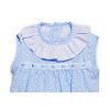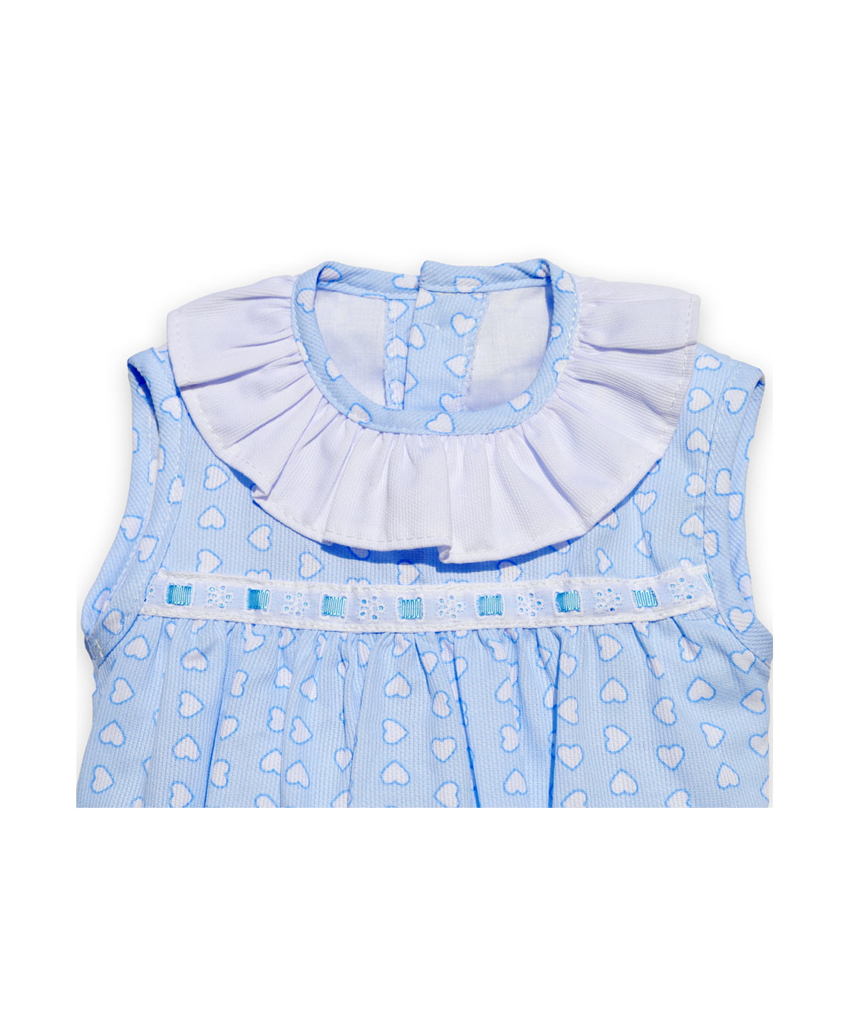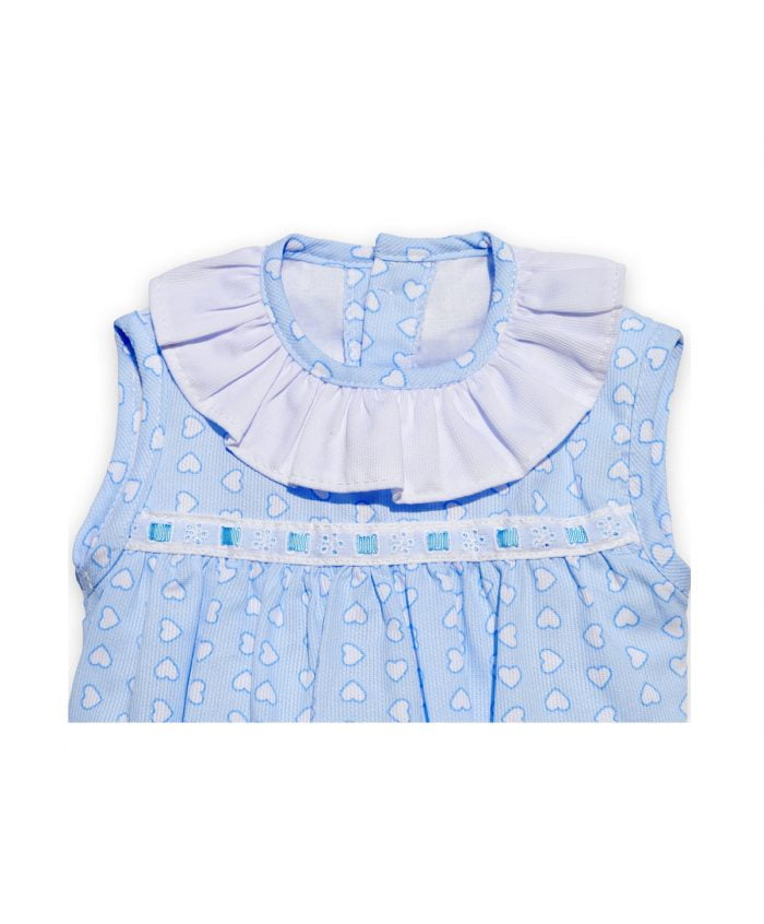 The armholes and round neck are bound, and the neck is finished with a white cotton frill. The front of the Heart Printed Baby Romper has gathered for fullness and is trimmed with a delicate ribbon. It fastens at the bottom with two buttons and at the rear with four buttons. The leg openings are elasticated for comfort during wear. On either side of the back placket are two inverted pleats running from the shoulder to the leg openings. Internally, the top is lined with white cotton fabric for comfort against the child’s skin.